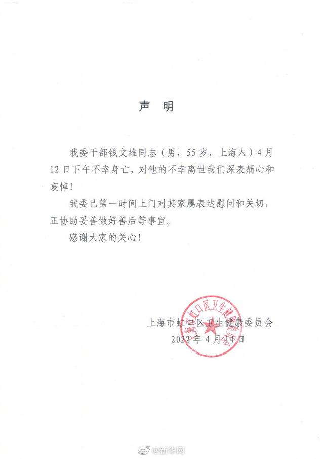 上海市虹口区卫生健康委员会14日通报称,该委干部钱文雄同志(男,55岁,上海人)4月12日下午不幸身亡,对他的不幸离世该委深表痛心和哀悼。