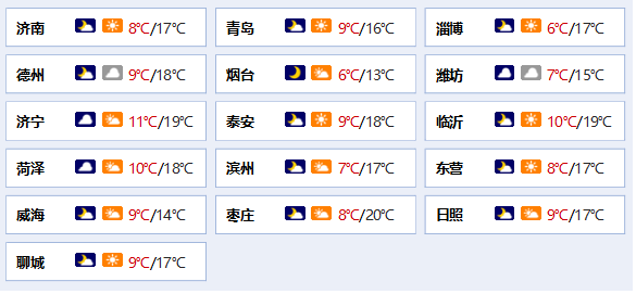 最低气温:鲁西北的西部和鲁南地区10℃左右,其他地区7℃左右。 最高气温:鲁中山区和半岛北部地区14℃左右,其他地区18℃左右。