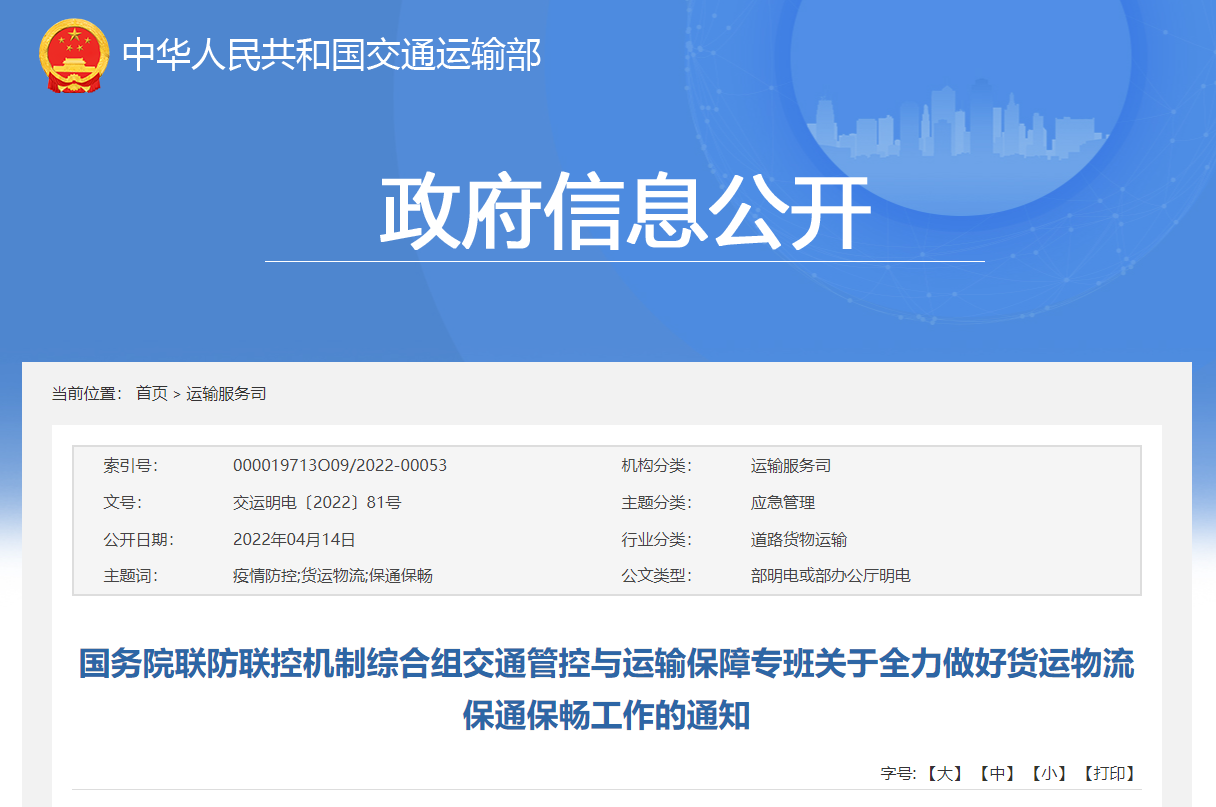 4月14日,国务院联防联控机制综合组交通管控与运输保障专班发布关于全力做好货运物流保通保畅工作的通知 。