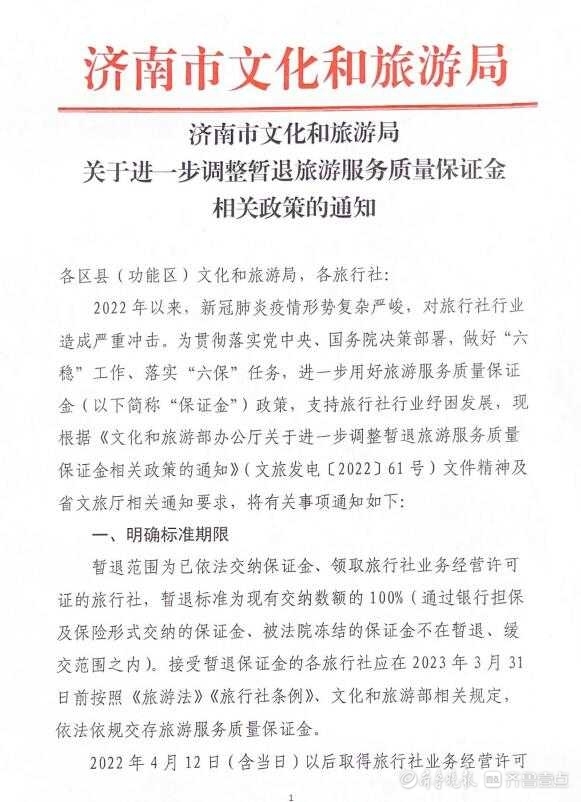 4月14日,济南市文化和旅游局印发《关于进一步调整暂退旅游服务质量保证金相关政策的通知》,济南市暂退旅游服务质量保证金比例由原来的80%提高至100%。