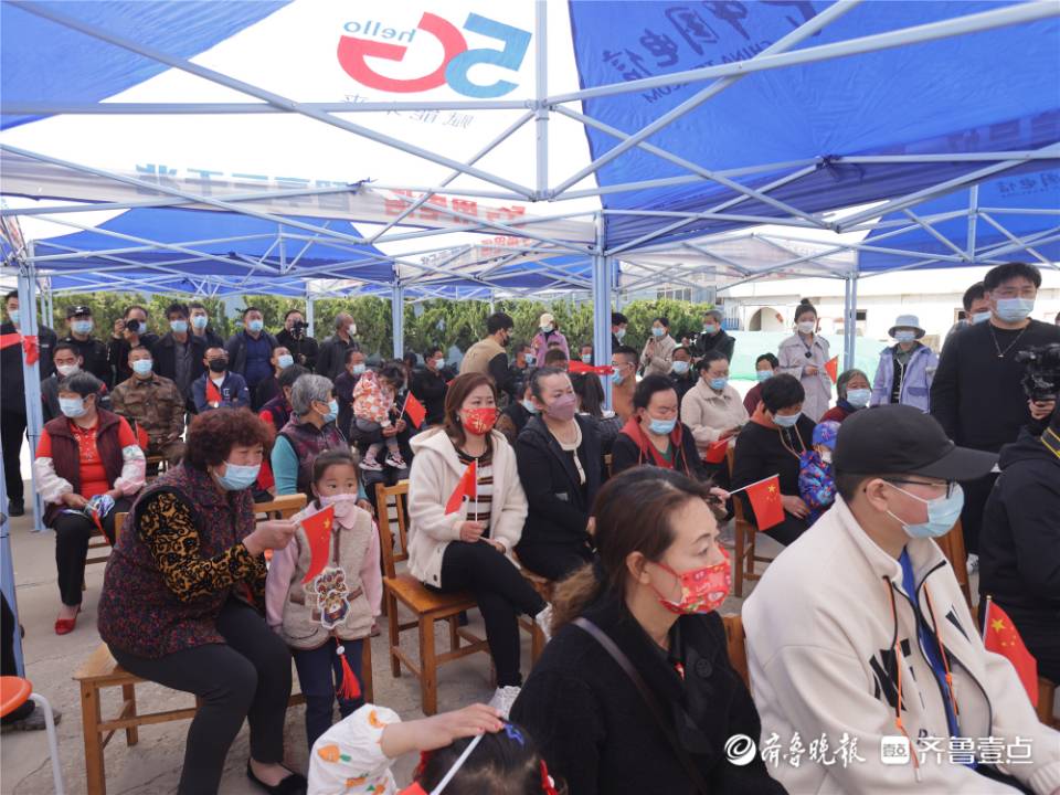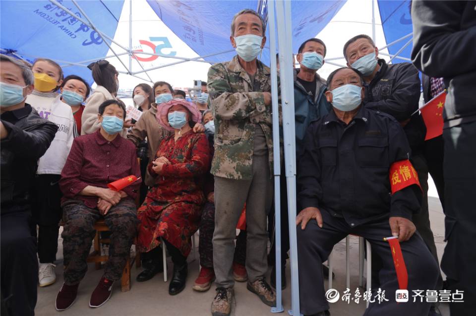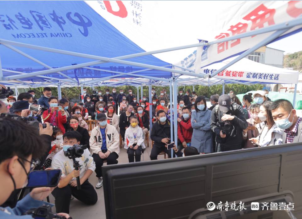 在福山区张格庄镇张格庄村村委大院内,村民们观看直播。