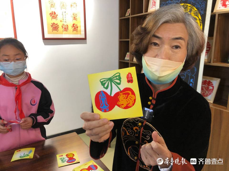 在烟台大樱桃博物馆里,卫爱君还设计制作了带有樱桃元素和航天元素的剪纸作品,并现场教张格庄小学的学生剪纸。