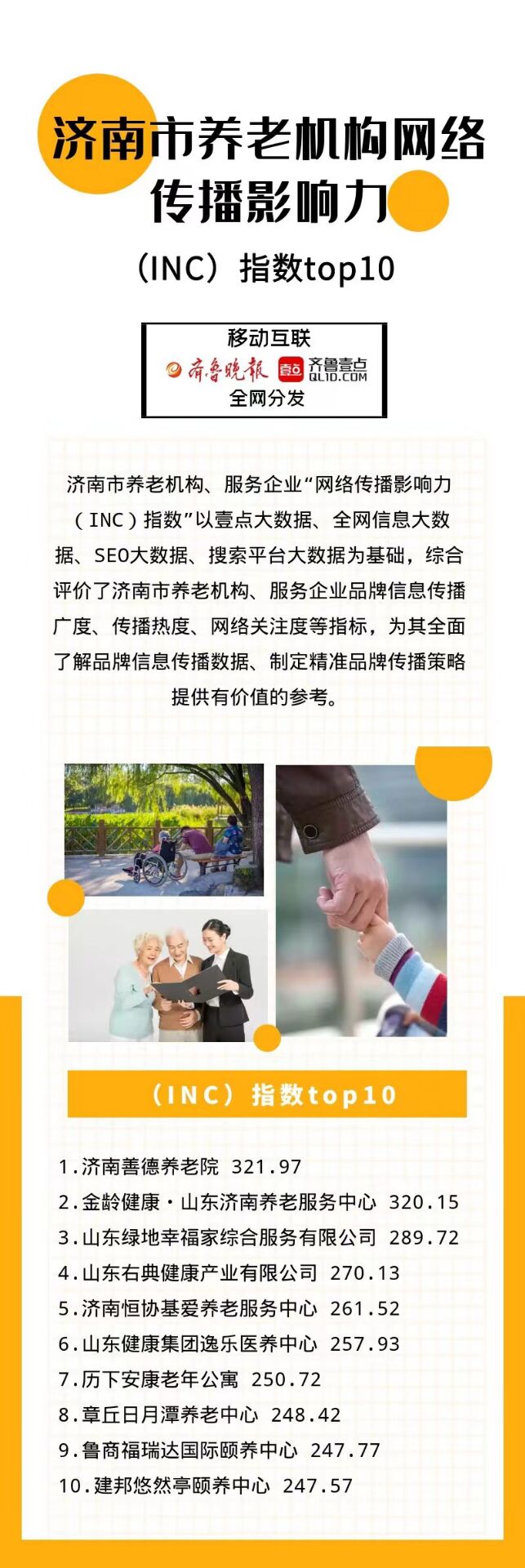 近日,齐鲁晚报·壹点智库发布济南市3月养老机构、服务企业网络传播影响力(INC)指数TOP10榜单,位居榜单前10位的依次是济南善德养老院、金龄健康•山东济南养老服务中心、山东绿地幸福家综合服务有限公司、山东右典健康产业有限公司、济南恒协基爱养老服务中心、山东颐养健康集团章丘逸乐医养中心、历下区安康老年公寓、章丘日月潭养老中心、鲁商福瑞达国际颐养中心、建邦·悠然亭颐养中心。
