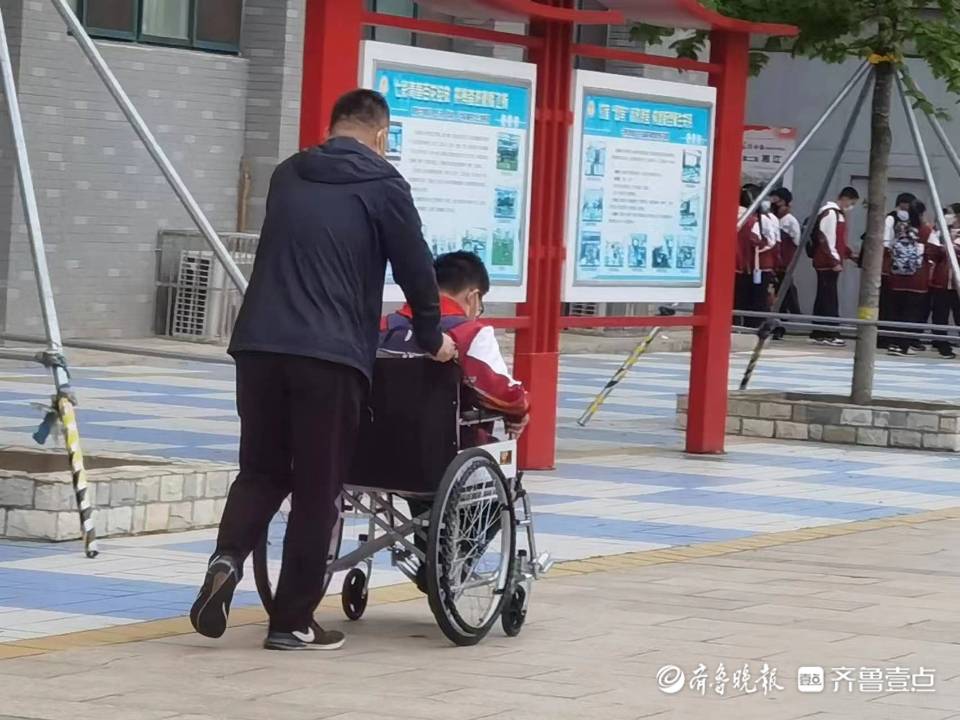 学校南门上学放学人员、车流量大,学校就特别开放了北门让安同学的家长接送他上下学,还暖心地为安同学配备了轮椅,这样,老师和同学们就可以慢慢地用轮椅推着他。