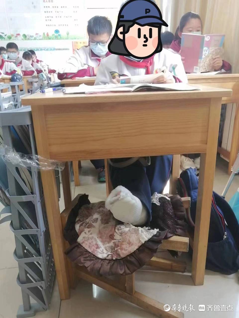 两周前,日照市新营中学七年级八班的安同学不慎摔伤,造成右脚骨折撕裂,无法正常行走,为了不耽误学习,他坚持要到学校上学,但疫情防控期间,家长不能进校园。他的班主任冷冰军知道情况后,主动担起了在校园里照顾他的责任。为了方便安同学打了石膏的腿,冷老师单独调了座位,找来了一个凳子放倒,让安同学将腿放到凳子上,脚抬高点,减少些疼痛,恢复的也能更快一些。