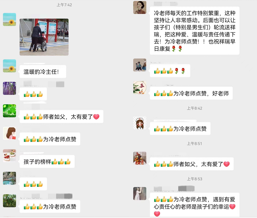 “我始终把班里的每一个孩子当成自己的孩子看待,单纯地想为学生做点事,这也是一个老师应该做的,我相信学校任何一个老师遇到这种情况都会尽自己的能力去帮助孩子的,学校里这样的暖心事有很多,我们学校就是这样一个其乐融融、和谐互助的大家庭。”冷冰军说,“我也很欣慰,让每一个孩子在班级这个大家庭里感受到集体的温暖和力量,让互帮互助的精神在班级里闪光。”