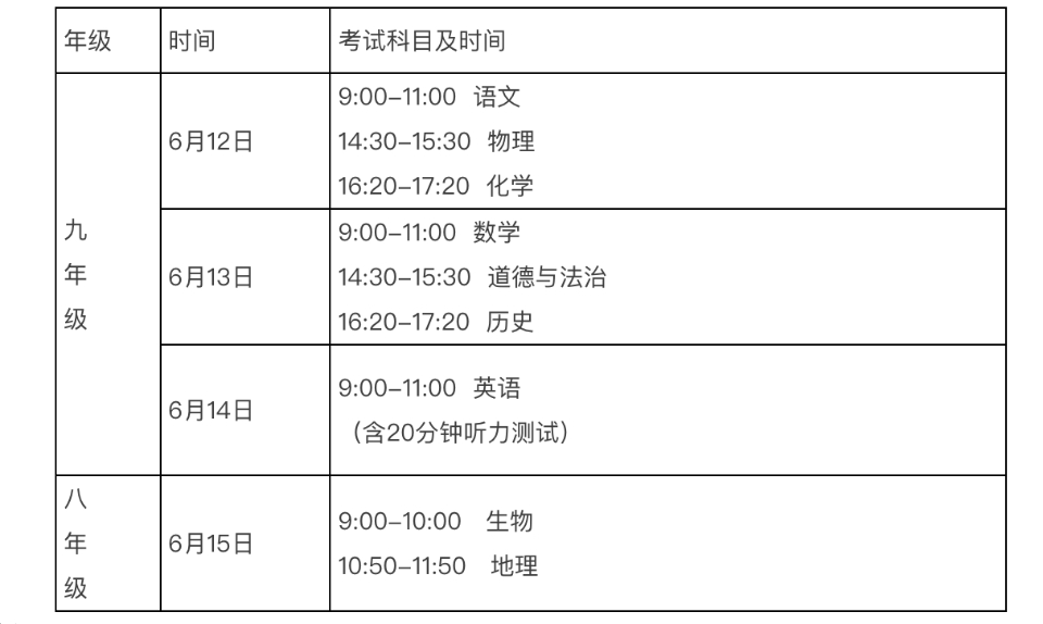 初中学业水平考试(中考)按照“学完即考”的原则,八年级学业水平考试科目为生物、地理;九年级学业水平考试(考查)科目为语文、数学、英语、物理、化学、道德与法治、历史、体育与健康、信息技术、综合实验操作、音乐、美术和综合实践。