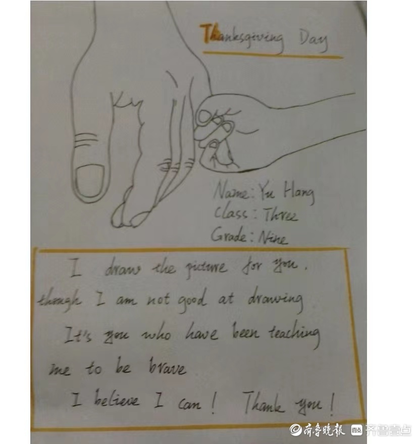 “他给出的理由是困难时,老师总是向他伸出援助之手;失败时,老师会用手轻轻拍拍他的后背以示安慰和鼓励;成功时,老师则会伸出手与他击掌表示祝贺。所以他想借感恩节祝福和感谢我以及天下所有老师。”马瑞菊说,作为班主任,能在教育生涯中,影响、改变和成就学生;陪伴、助力学生成长;感受、体验学生成长之快乐;我好幸福!”