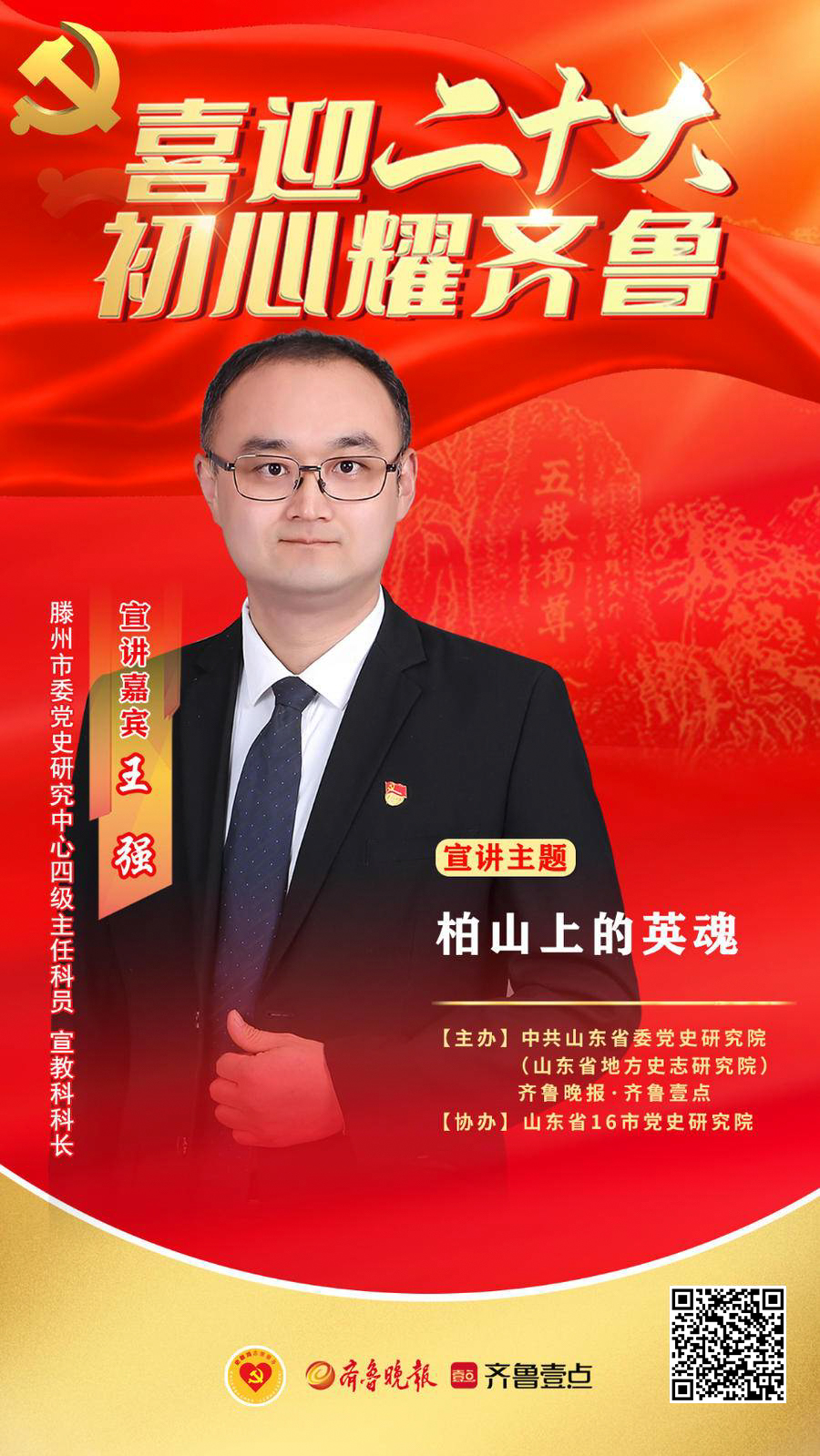 海报|王强:柏山上的英魂 齐鲁党建云 2022-05-12 4470 喜迎二十大·初心耀齐鲁!中共山东省委党史研究院(山东省地方史志研究院)与齐鲁晚报·齐鲁壹点联合主办,山东16市党史研究院协办,共同推出“喜迎二十大·初心耀齐鲁——山东省党史史志系统党史宣讲大型融媒策划”。本期宣讲嘉宾为滕州市委党史研究中心四级主任科员、宣教科科长王强。宣讲主题为《柏山上的英魂》。 责任编辑:李和晴