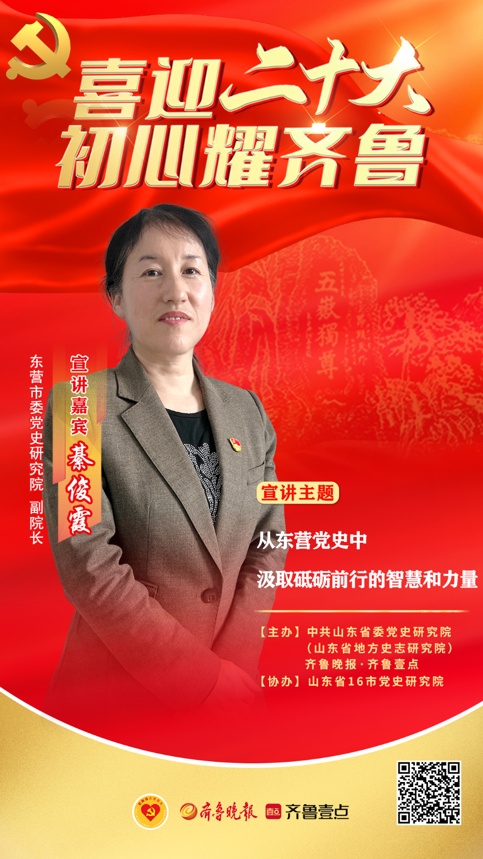 海报|东营 綦俊霞:从东营党史中汲取砥砺前行的智慧和力量 大众报业·齐鲁壹点 2022-05-26 3934 喜迎二十大·初心耀齐鲁!中共山东省委党史研究院(山东省地方史志研究院)与齐鲁晚报·齐鲁壹点联合主办,山东16市党史研究院协办,共同推出“喜迎二十大·初心耀齐鲁——山东省党史史志系统党史宣讲大型融媒策划”。本期宣讲嘉宾为东营市委党史研究院副院长綦俊霞。宣讲主题为《从东营党史中汲取砥砺前行的智慧和力量》。 责任编辑:聂婧怡