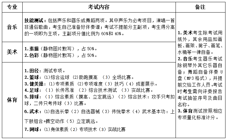 体育: 5月21日上午10:00开始;田径和足球测试地点:北操场。健美操测试地点:体育馆三楼健美操训练馆。篮球测试地点:南操场。排球测试地点:体育馆三楼。武术测试地点:体育馆三楼北侧。网球测试地点:北操场北侧。