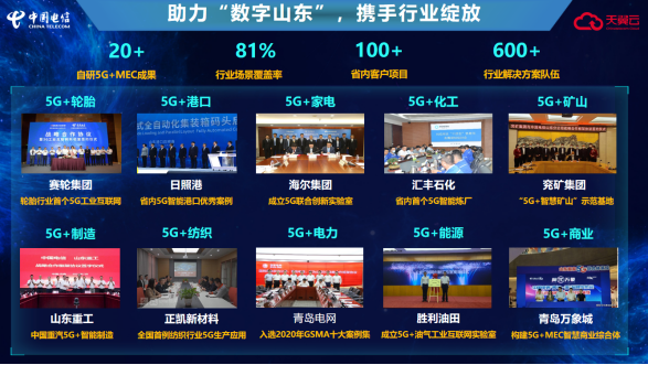 山东电信紧紧把握近年来通信信息产业的大变革、大融合的发展趋势,积极发挥自身优势,参与山东省各行各业信息化建设,打造行业数字化平台,覆盖工业互联网、智慧教育、智慧医疗、数字政府等多个领域,打造了青岛供电公司“5G+智慧电力”、日照港“5G智慧港口”、山东汇丰石化“5G智慧炼钢厂”、赛轮集团“5G轮胎工业互联网”等累计106个5G商用场景。2022年计划实现120+的5G商用项目落地,积极赋能传统产业转型升级。