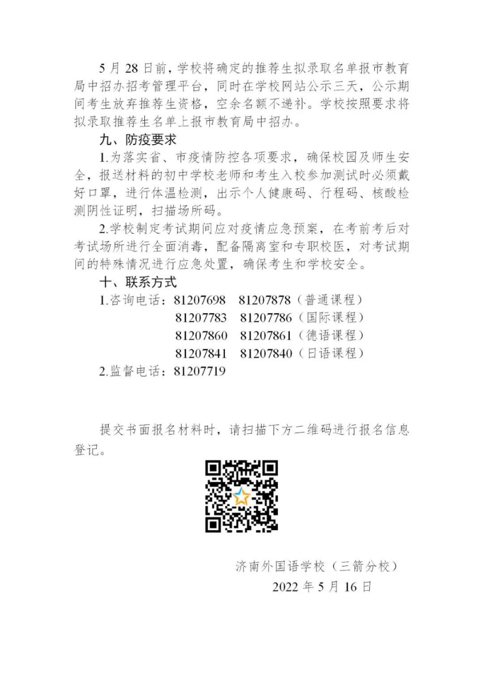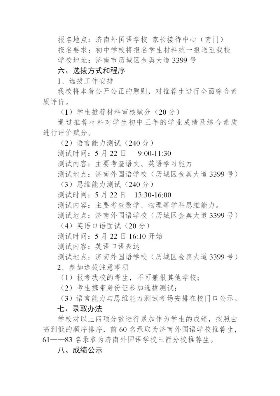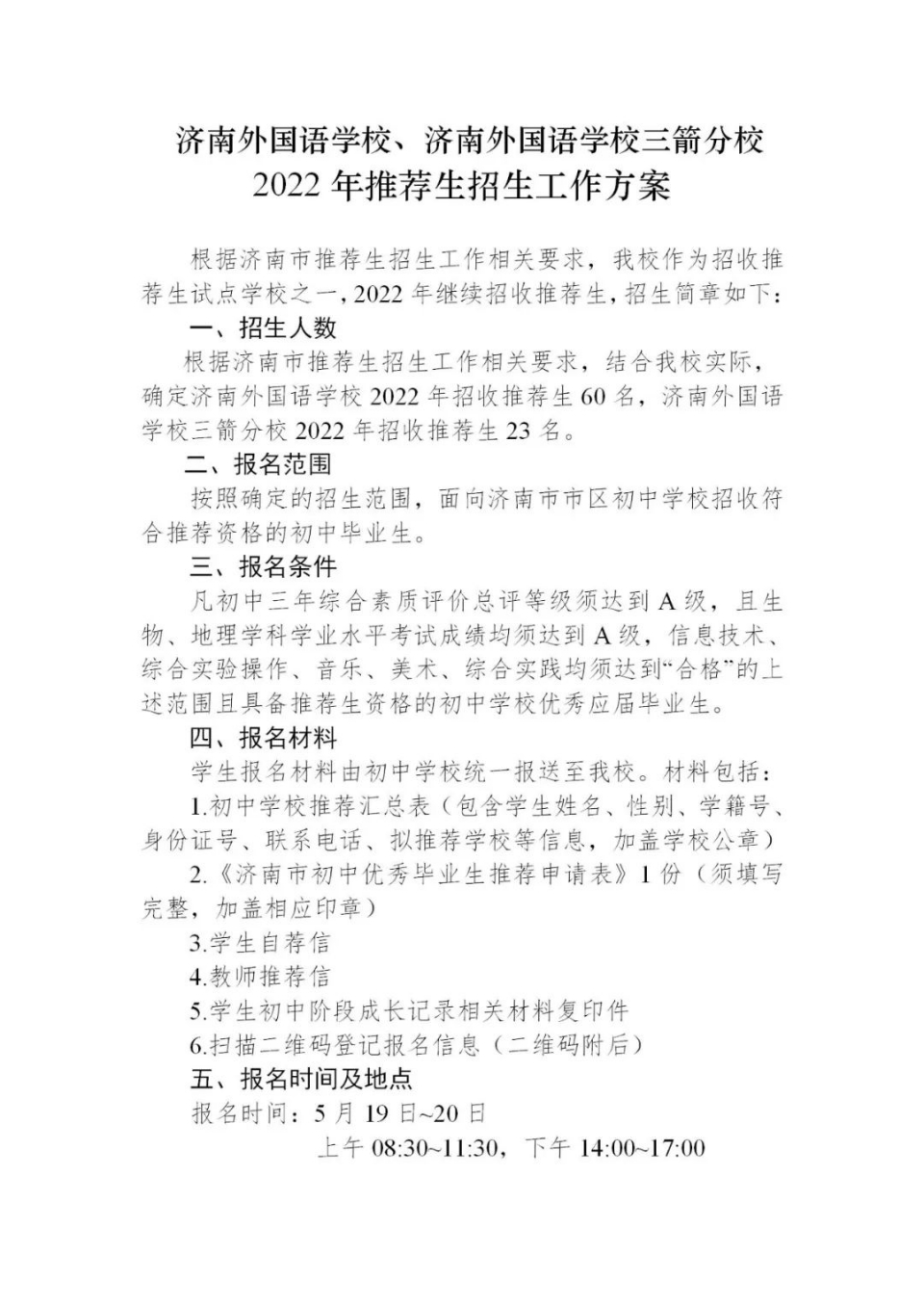 5月17日,济南外国语学校、济南外国语学校三箭分校公布2022年推荐生招生工作方案,共计招收83名。