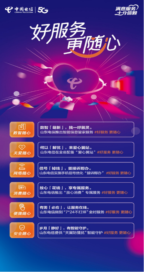 “好服务 更随心”! 中国电信山东分公司将始终秉持“用户至上,用心服务”的服务理念,以客户为中心,扎实推进各项服务举措落地,用始终如一的不懈努力,让数智服务全面覆盖、让客户消费明明白白、让关爱服务无处不在。