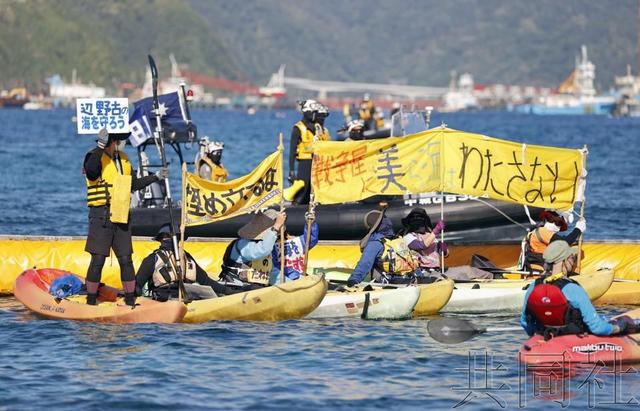 名护市反对机场迁入的民众在海上进行抗议活动,要求停止填海造地。