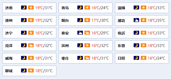 最低气温:鲁中山区、鲁东南和半岛南部地区16℃左右,其他地区18℃左右。