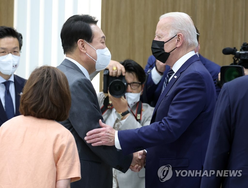 拜登和尹锡悦在三星电子半导体工厂首次会面。图源:韩联社