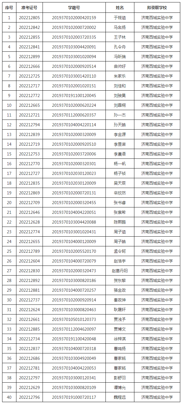 按照济南市教育局关于推荐生选拔工作的要求,通过综合素质测试和综合素质面试的考查,按照综合成绩排名和考生志愿,确定40名同学(最后一名同分并列)为济南西城实验中学2022年拟录取推荐生,确定13名同学(最后一名同分并列)为济南医学中心实验中学2022年拟录取推荐生,现公示如下(名单按姓氏笔画排序):