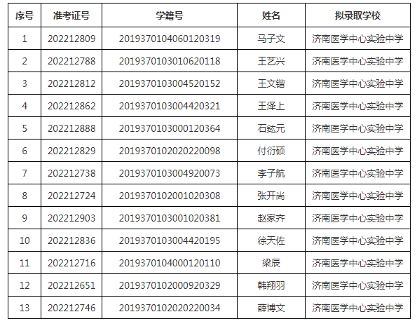 济南医学中心实验中学拟录取推荐生名单