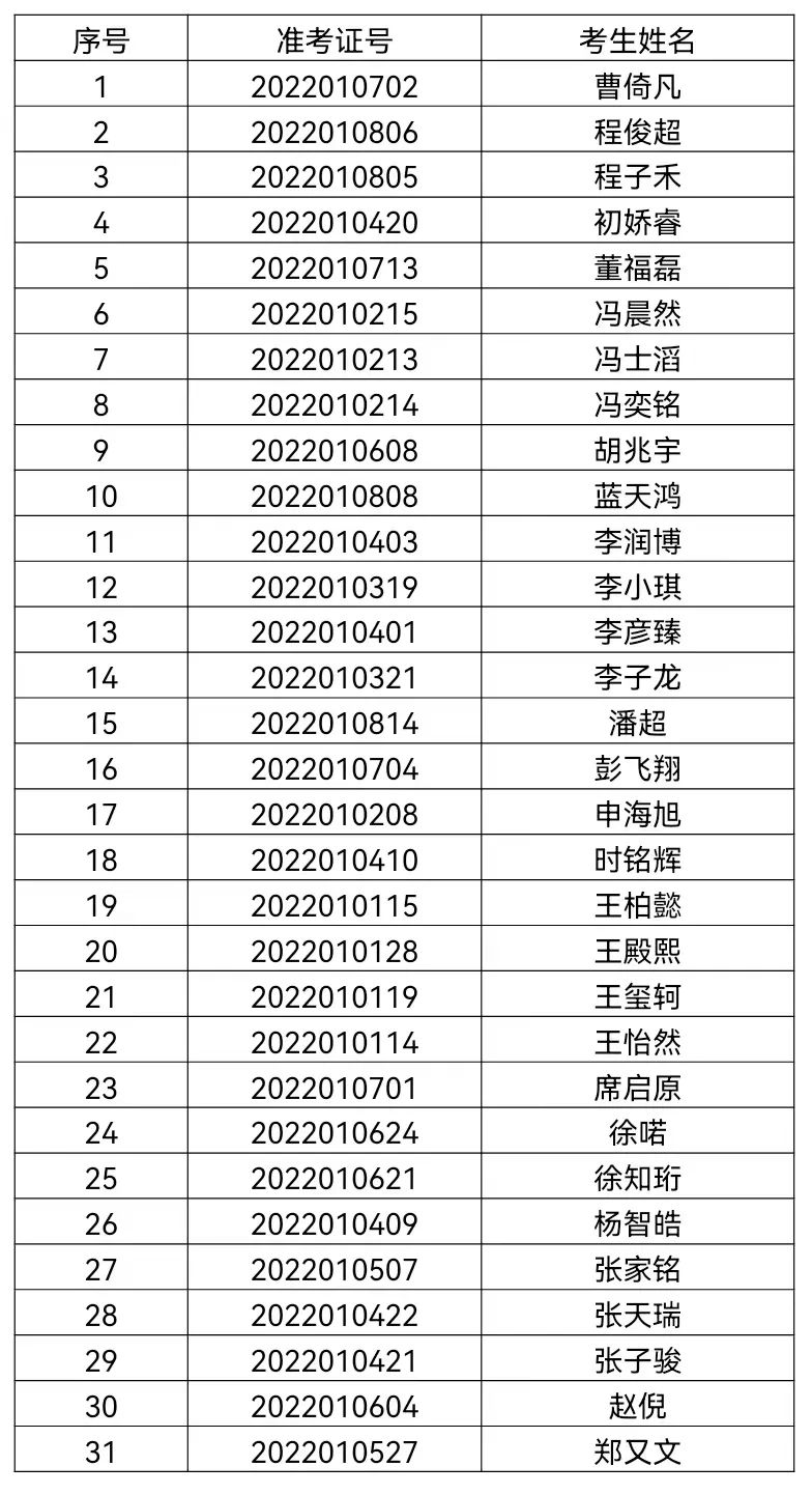 按照济南市2022年高中阶段学校招生工作要求及学校2022年推荐生招生工作方案,通过综合素质测试和综合素质面试的考查,按照综合成绩排名,确定以下31名同学(同分并列同录)为我校2022年拟录取推荐生,现予以公示(名单按姓氏首字母排序),公示期3天。