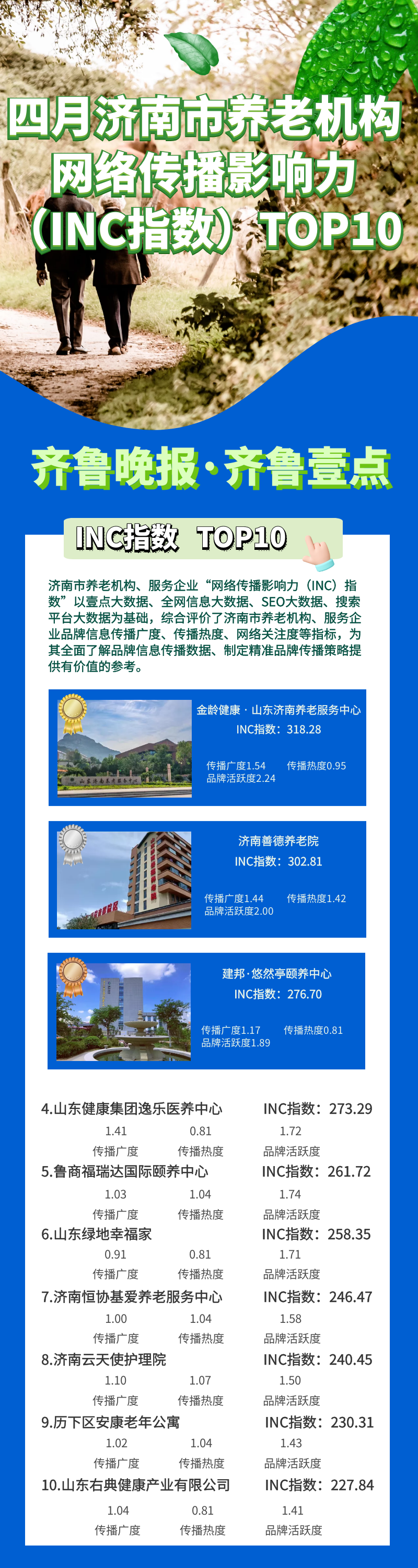 25日,齐鲁晚报壹点智库发布2022年4月济南市养老机构、企业网络传播影响力(INC指数)榜单,金龄健康·山东济南养老服务中心居INC指数榜单首位,建邦·悠然亭颐养中心从上个月的第十名上升到第三名。