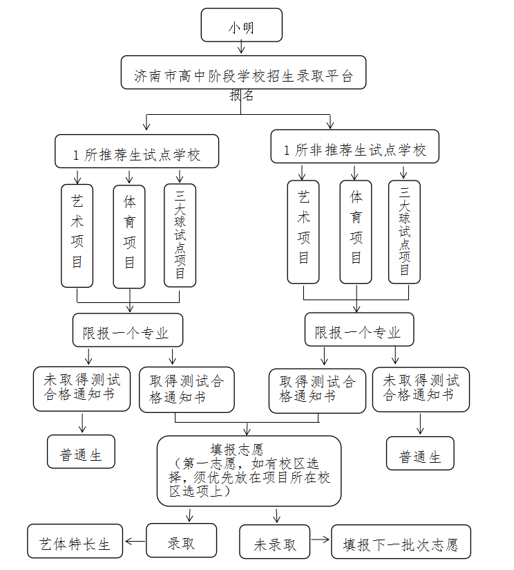 注:以上流程图仅做济南考生(不含莱芜区、钢城区)的参考,具体报名、录取按照《2022年济南市普通高中学校招收艺体特长生工作方案》执行。