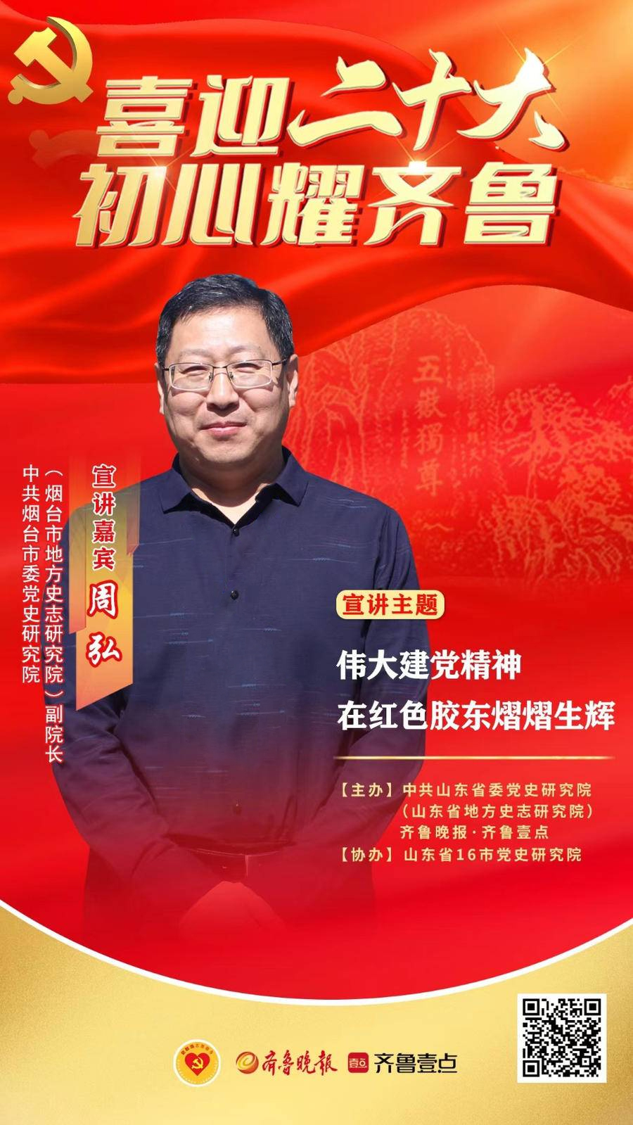 海报|周弘:伟大建党精神在红色胶东熠熠生辉 大众报业·齐鲁壹点 2022-06-09 1168 喜迎二十大·初心耀齐鲁!中共山东省委党史研究院(山东省地方史志研究院)与齐鲁晚报·齐鲁壹点联合主办,山东16市党史研究院协办,共同推出“喜迎二十大·初心耀齐鲁——山东省党史史志系统党史宣讲大型融媒策划”。本期宣讲嘉宾为烟台市委党史研究院(烟台市地方史志研究院)副院长周弘。宣讲主题为《伟大建党精神在红色胶东熠熠生辉》。 责任编辑:李和晴