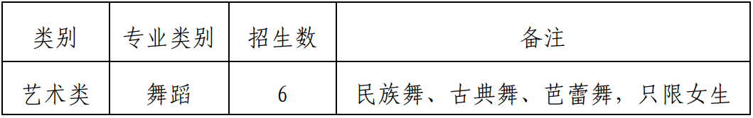 限民族舞、古典舞、芭蕾舞,只招女生。初中阶段在教育主管部门举办的比赛中获得市级及以上舞蹈一等奖(提供有效获奖证书)或有发展潜力的优秀学生,需具备专业学习的基本素质与条件,形象好、气质佳,净身高不低于1.65米,专业测试现场进行身高测量。(备注:条件优秀者身高条件可适当放宽)
