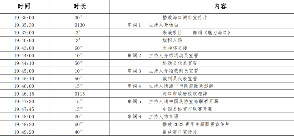 6月3日20:00,2022赛季中超即将打响揭幕战,在海口五源河体育场,由山东泰山队对阵浙江。记者了解到,新赛季开幕式将在赛前半小时进行,整个开幕式流程约为15分钟,包含舞蹈《魅力海口》 、旗帜入场、火神杯交接、宣誓等多个环节。