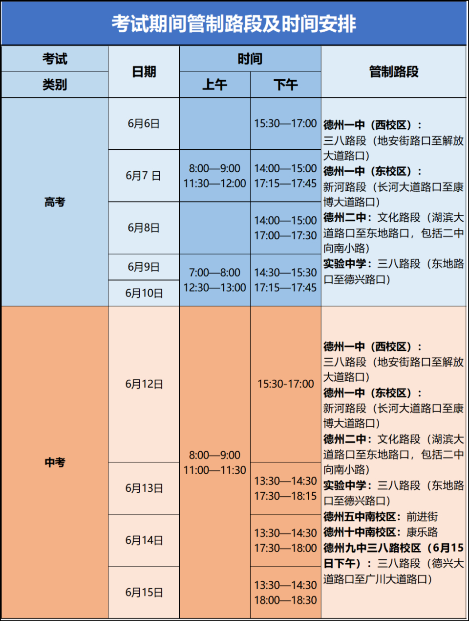 6月3日,德州市公安局交警支队发布《关于高考、中考期间对市区部分路段实行交通管制的通告 》。公告内容如下,2022年夏季高考与普通高中学业水平等级考试(以下简称高考)于6月7日至10日进行,初中学业水平考试(以下简称中考)于6月13日至15日进行。为确保考试工作安全顺利进行,考试期间,需对通往市区各考点的主要路段采取临时交通管制措施,车辆禁止通行,考场周边道路行驶车辆禁止鸣笛,具体管制时间和路段见附件。各县市、陵城区参照执行。请广大市民提前安排好出行路线,自觉服从交警部门管理;对您出行造成的不便,敬请理解和支持。