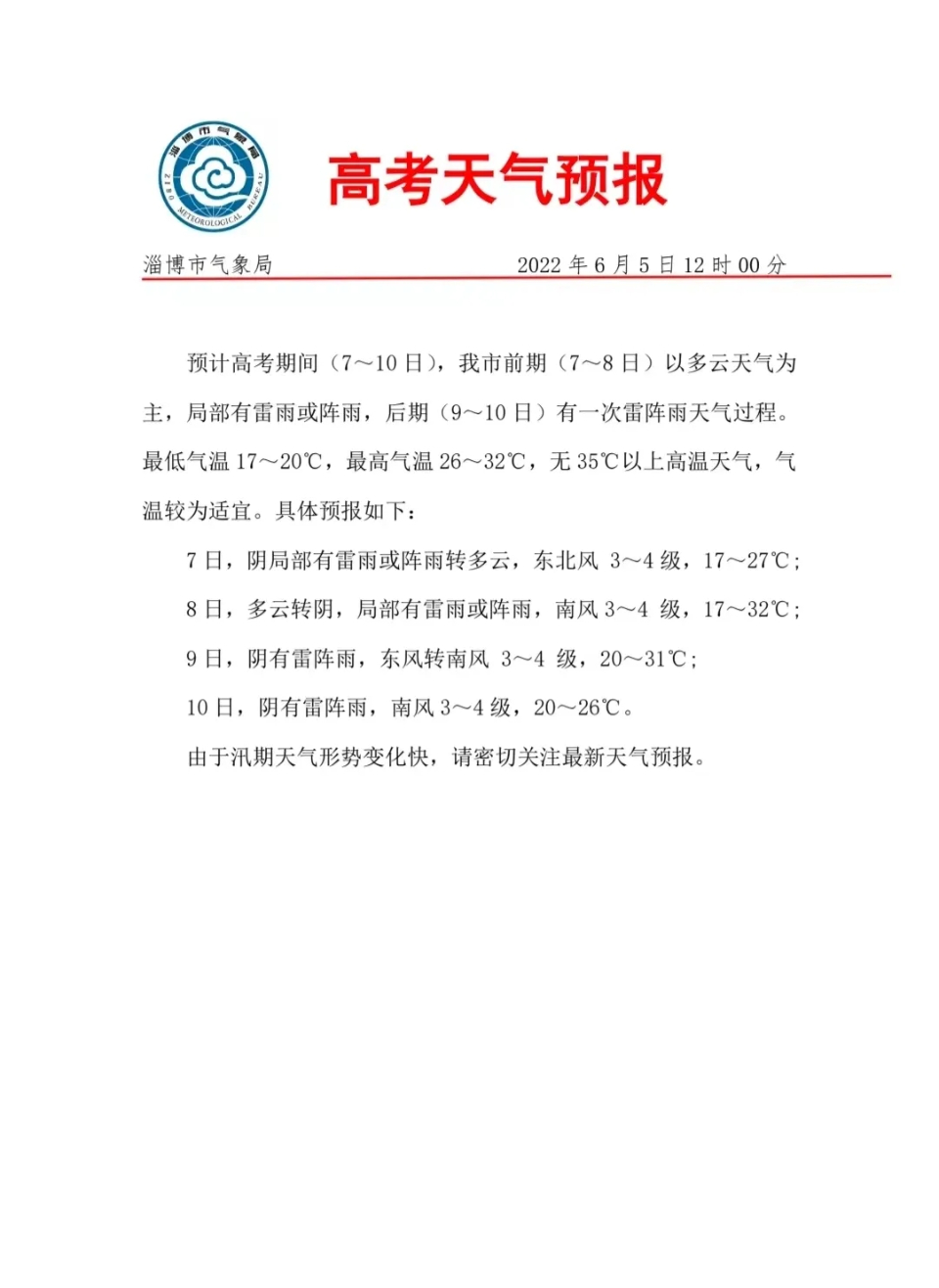 6月5日,淄博市气象局发布高考天气预报,预计高考期间,7日至8 日,淄博市以多云天气为主,局部有雷雨或阵雨;9日至10 日,有一次雷阵雨天气过程,最低气温 17℃~20℃,最高气温 26℃~32℃,无 35℃以上高温天气,气温较为适宜。