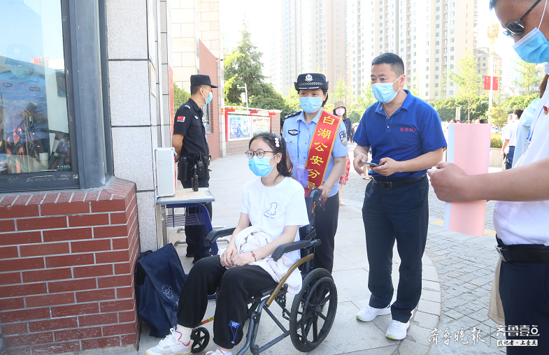 6月7日,高考首日,济宁一中太白湖校区,两名考生座轮椅赴考,济宁市公安局北湖分局(以下简称北湖分局)民警分别护送两名学子顺利参加考试。