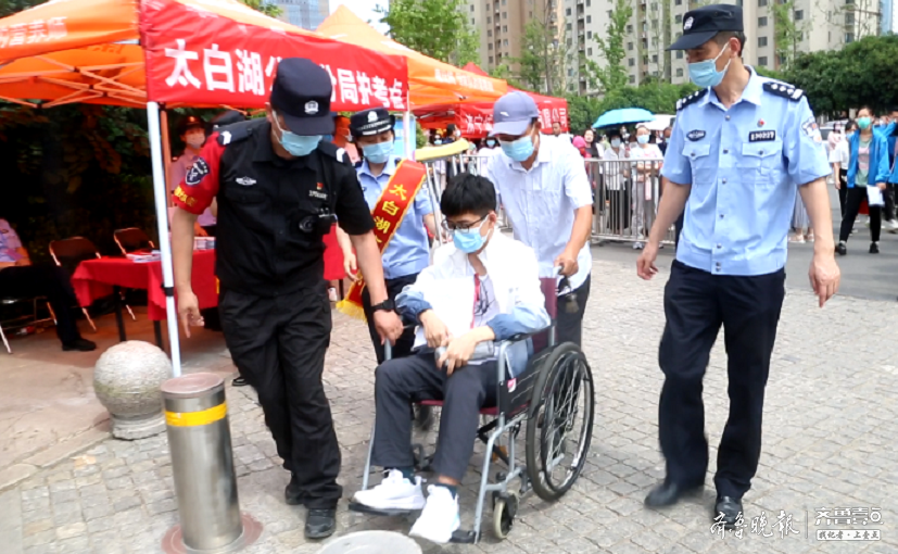 6月7日,高考首日,济宁一中太白湖校区,两名考生坐轮椅赴考,济宁市公安局北湖分局(以下简称北湖分局)民警分别护送两名学子顺利参加考试。