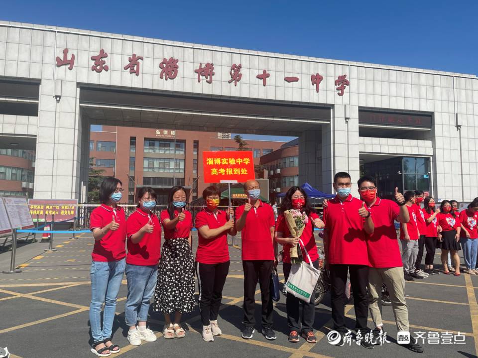 考场前,由8名身穿红色制服的“教师团”也在淄博十一中考场门口形成了一道靓丽的风景线,记者了解到,他们是来自淄博实验中学6名高三班主任与2名语文老师组成的“报到团队”。