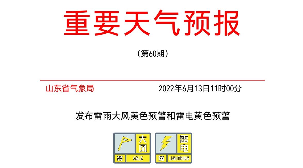 山东省气象台于6月13日11时00分发布雷雨大风黄色预警和雷电黄色预警:受冷涡影响,预计13日中午到夜间,山东大部地区及渤海、渤海海峡自西向东将有强对流天气,伴有雷电、8~10级雷雨阵风,局部有冰雹。全省平均降水量5~10毫米,雨量分布不均,其中滨州、东营、济南、泰安、淄博、潍坊、菏泽东部、济宁、枣庄、临沂降水量10~20毫米局部50毫米以上,其他市1~5毫米,1小时最大降水量20~40毫米。