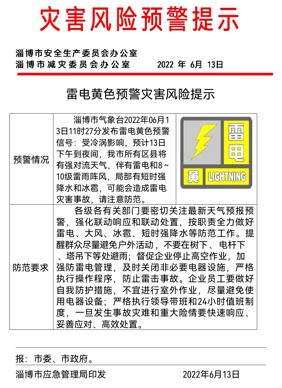 淄博市安全生产委员会办公室、淄博市减灾委员会办公室发布雷电黄色预警灾害风险提示:各级各有关部门要密切关注最新天气预报预警,强化联动响应和联动处置,按职责全力做好雷电、大风、冰雹、短时强降水等防范工作。提醒群众尽量避免户外活动,不要在树下、电杆下、塔吊下等处避雨;督促企业停止高空作业,加强防雷电管理,及时关闭非必要电器设施,严格执行操作程序,防止雷击事故。企业员工要做好自我防护措施,不宜进行室外作业,尽量避免使用电器设备;严格执行领导带班和24小时值班制度,一旦发生事故灾难和重大险情要快速响应、妥善应对、高效处置。
