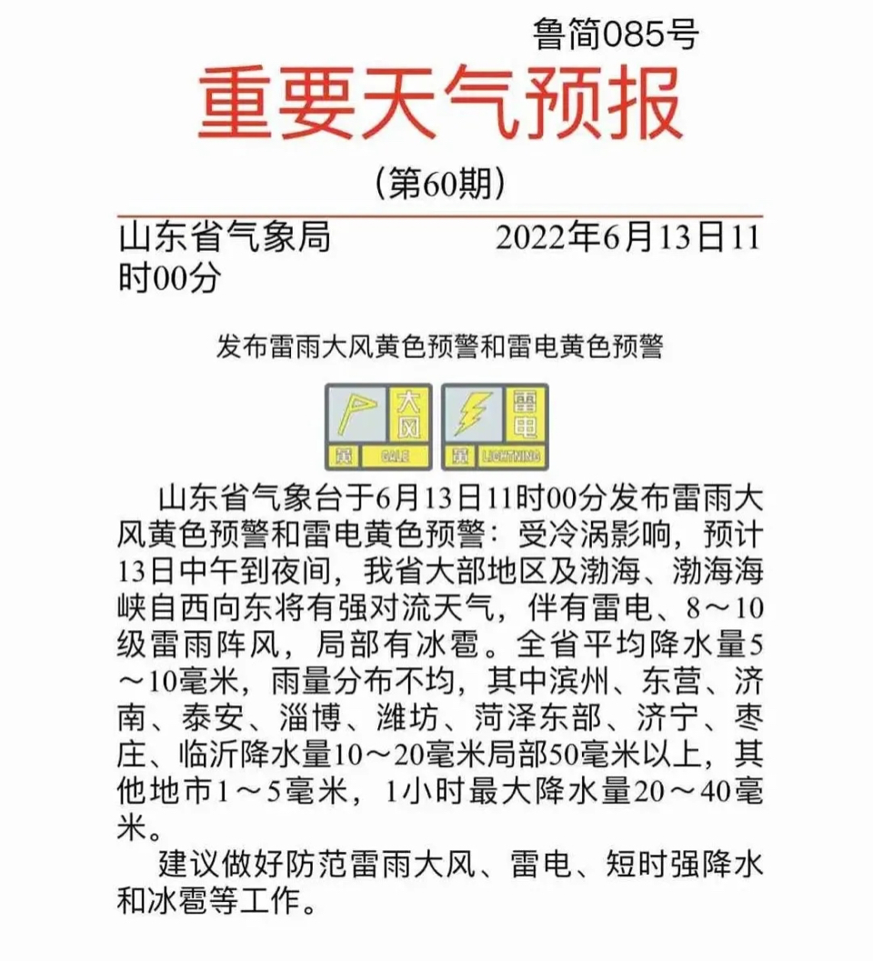 山东省气象台也于今天11时发布雷雨大风黄色预警和雷电黄色预警。