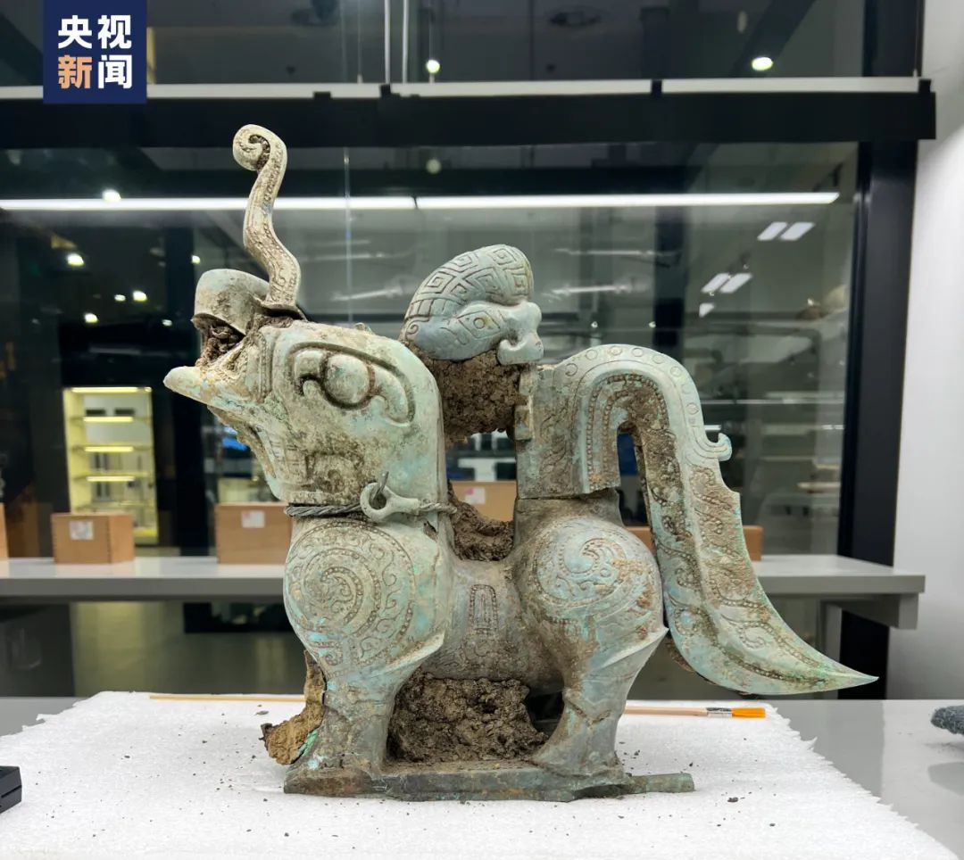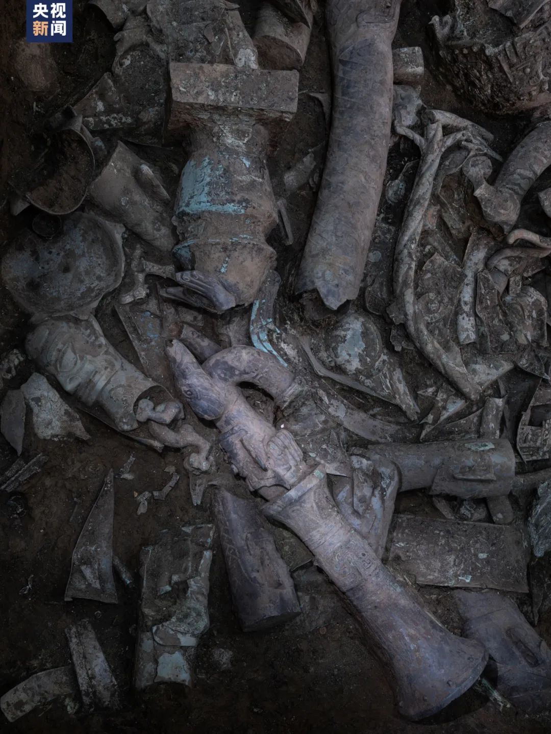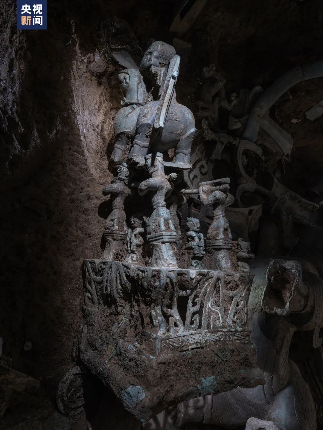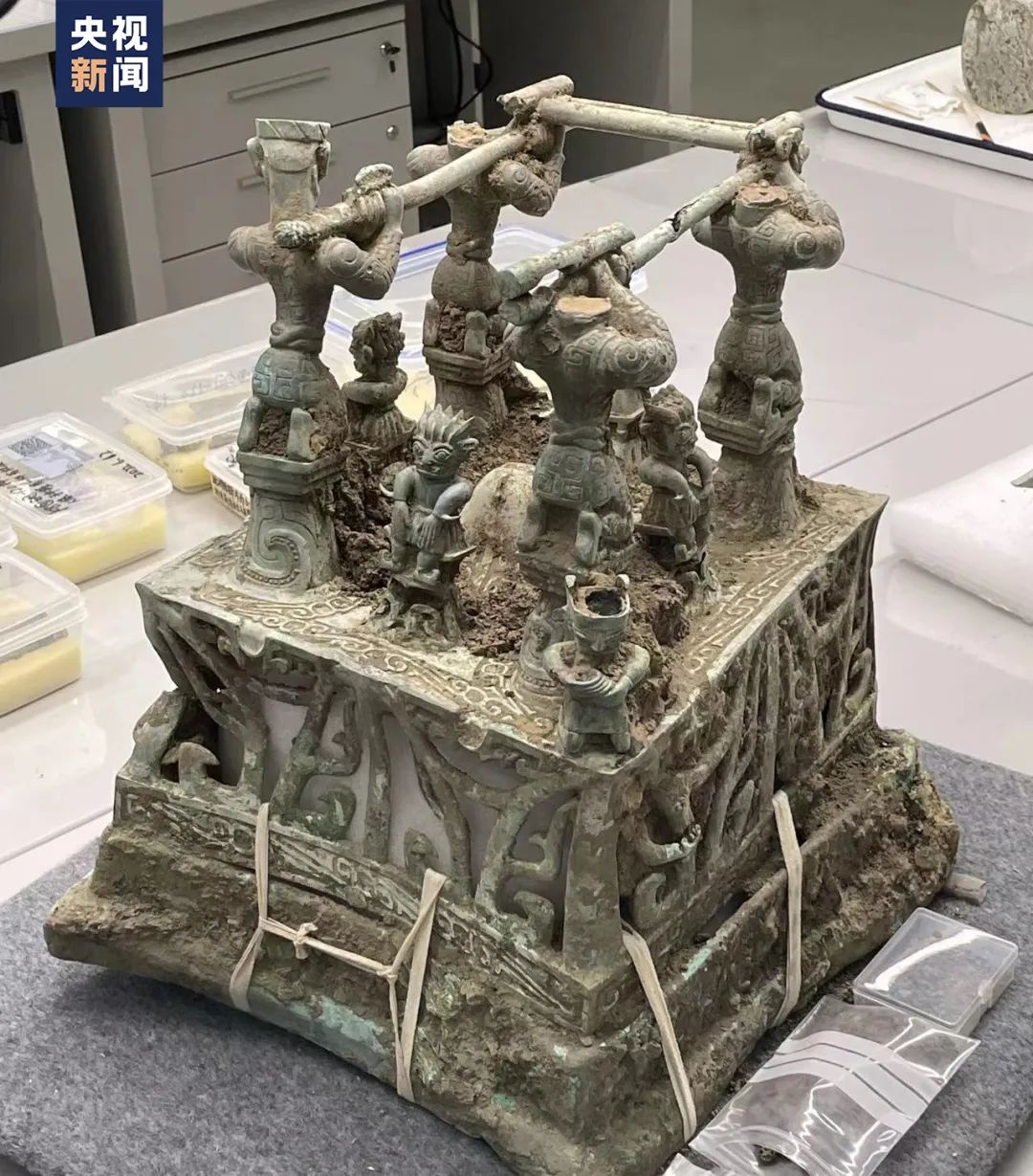 近日,8号坑内一尊造型独特、工艺复杂的 青铜神坛 被成功提取。目前青铜神坛的残件共分为三层,残高近1米高。