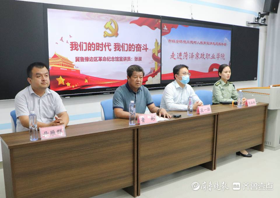 为丰富校园思政课内容,提高思政课教学实效,引导同学们厚植爱国主义情怀,6月14日下午,由市委宣传部、市委讲师团牵头成立的菏泽市级全环境立德树人教育宣讲团开启巡回宣讲,冀鲁豫边区革命纪念馆讲解员张淑姝来到菏泽家政职业学院,为全院9600余名学生讲了一堂生动思政课。菏泽家政职业学院党委委员、副院长鲁彬主持活动,市委讲师团讲师段一恒、学院学生工作处副处长母雁群出席。
