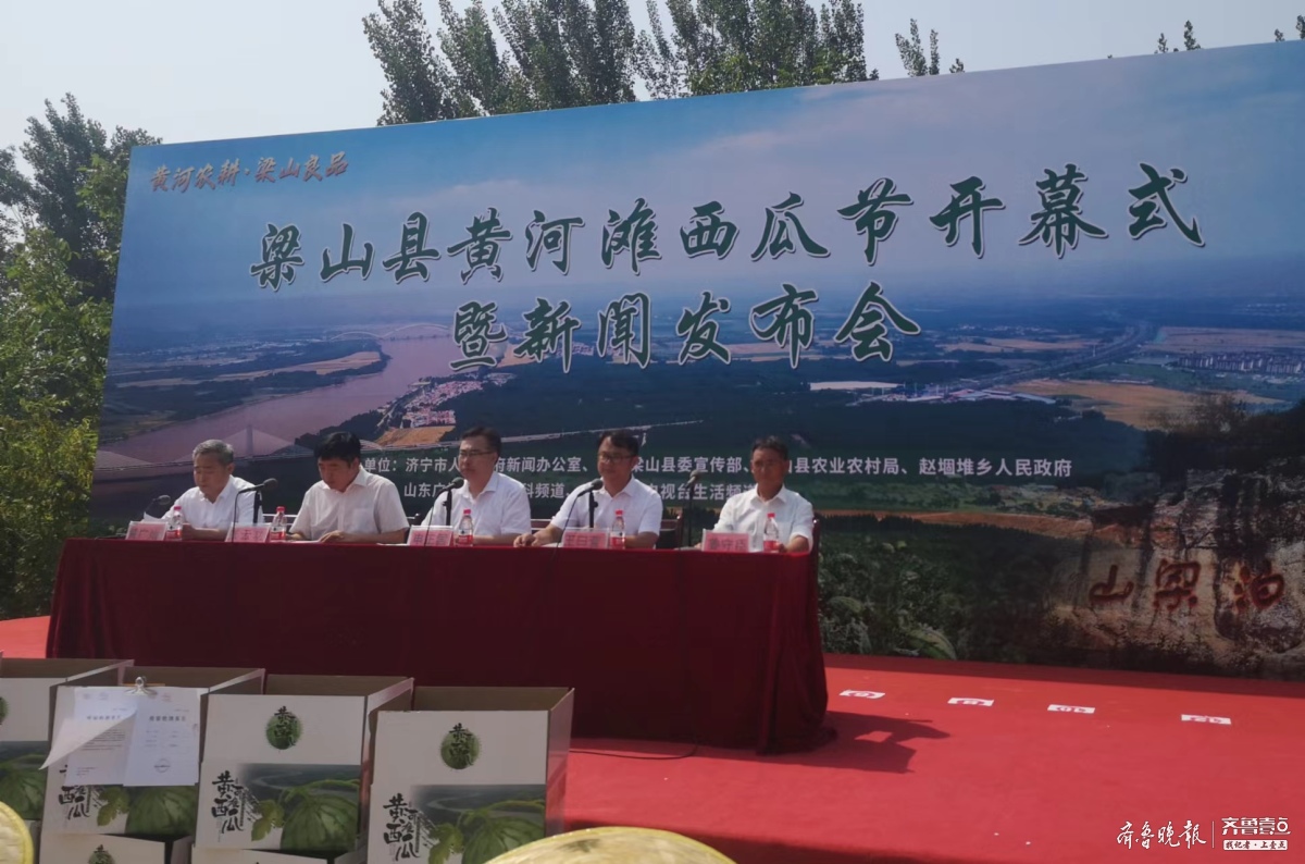6月17日,济宁市政府新闻办在梁山县赵堌堆乡黄河岸边召开 “黄河农耕·梁山良品”主题系列新闻发布会,目前,全县黄河滩区西瓜种植面积发展到5000余亩,年产1.8万吨,其中赵堌堆种植面积达3000余亩,成为了集体增收百姓致富的富民兴村产业。