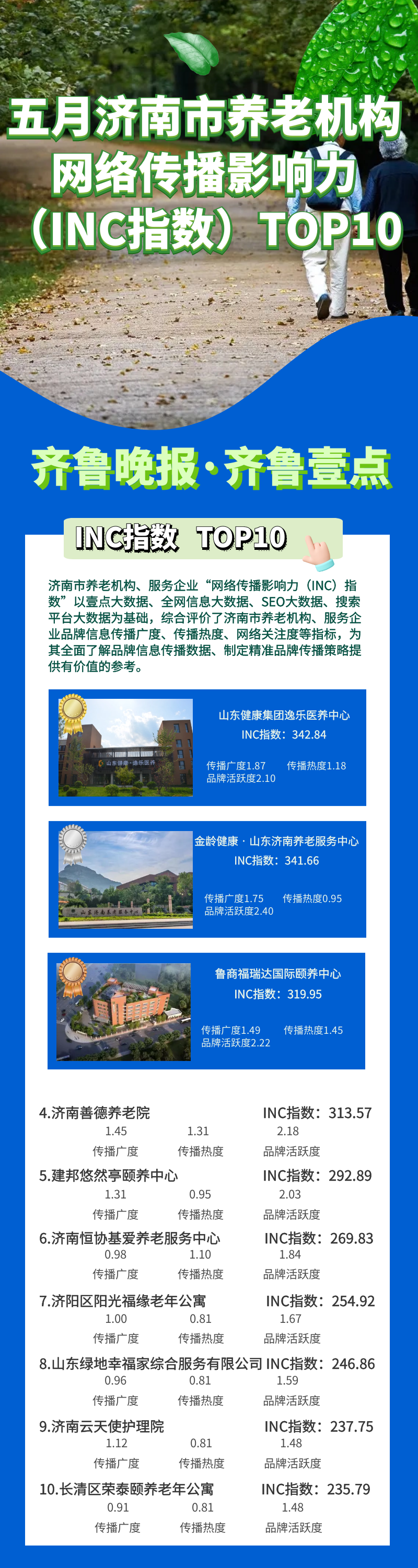 6月24日,齐鲁晚报壹点智库发布5月济南市50家入选养老机构(企业)的网络传播影响力指数(简称“INC指数”),其中,INC指数居前五位的分别是山东健康集团逸乐医养中心、金龄健康·山东济南养老服务中心、鲁商福瑞达国际颐养中心、济南善德养老院、建邦·悠然亭颐养中心。