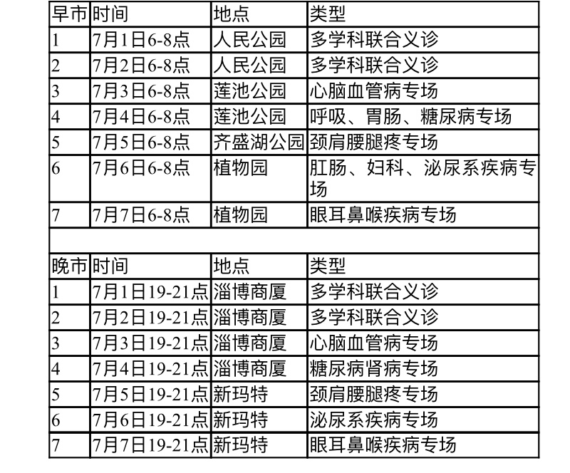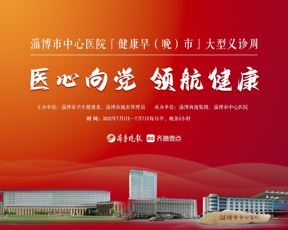 为庆祝“七一”党的生日,充分体现公立医院公益性,由淄博市卫生健康委、淄博市城市管理局主办,淄博商厦集团、淄博市中心医院承办的“医心向党领航健康——淄博市中心医院‘健康早(晚)市’大型义诊周”活动即将于7月1日正式启动,活动为期七天,每日早、晚义诊时间各两个小时。