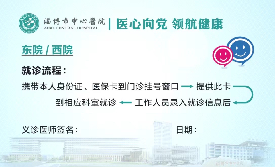 承接上述便民服务措施,在此次义诊活动周中,淄博市中心医院将为有需要的患者提供一张“便民就诊卡”。患者到医院就诊时,可凭借该卡免挂号费一次,且3日内有效。