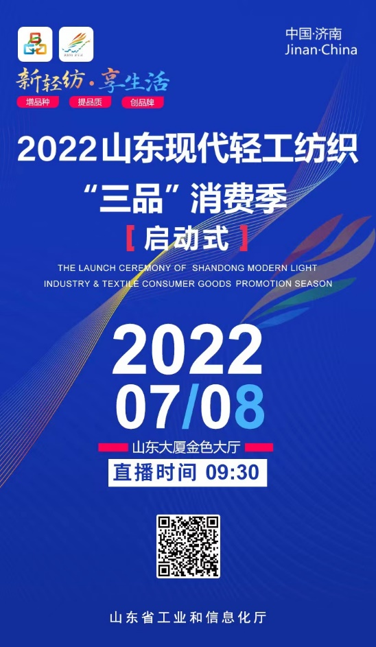 “新轻纺 享生活”,由山东省工业和信息化厅主办的2022现代轻工纺织“三品”消费季启动仪式将于7月8日在济南举行。据了解,本次活动是工业和信息化部2022“三品”全国行的首站。