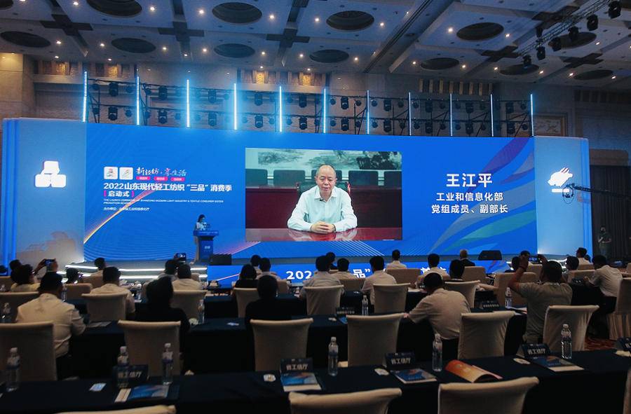 工业和信息化部副部长王江平通过视频的方式为活动致辞,他对山东轻工纺织产业的发展和本次“三品”全国行山东首站活动的举办表示高度认可。他指出,“山东轻工纺织产业规模大,基础好,这次活动有助于促进供需匹配和协调共进,进一步提升山东轻工纺织产业的竞争力和影响力,希望把轻工纺织产业高质量发展这篇文章做精、做细,以更好满足人民的美好生活需要;把产业数字化这篇文章做实、做透,推动“三品”战略再上新台阶;把稳增长、促销费这篇文章做足、做好,助力稳定宏观经济大盘。