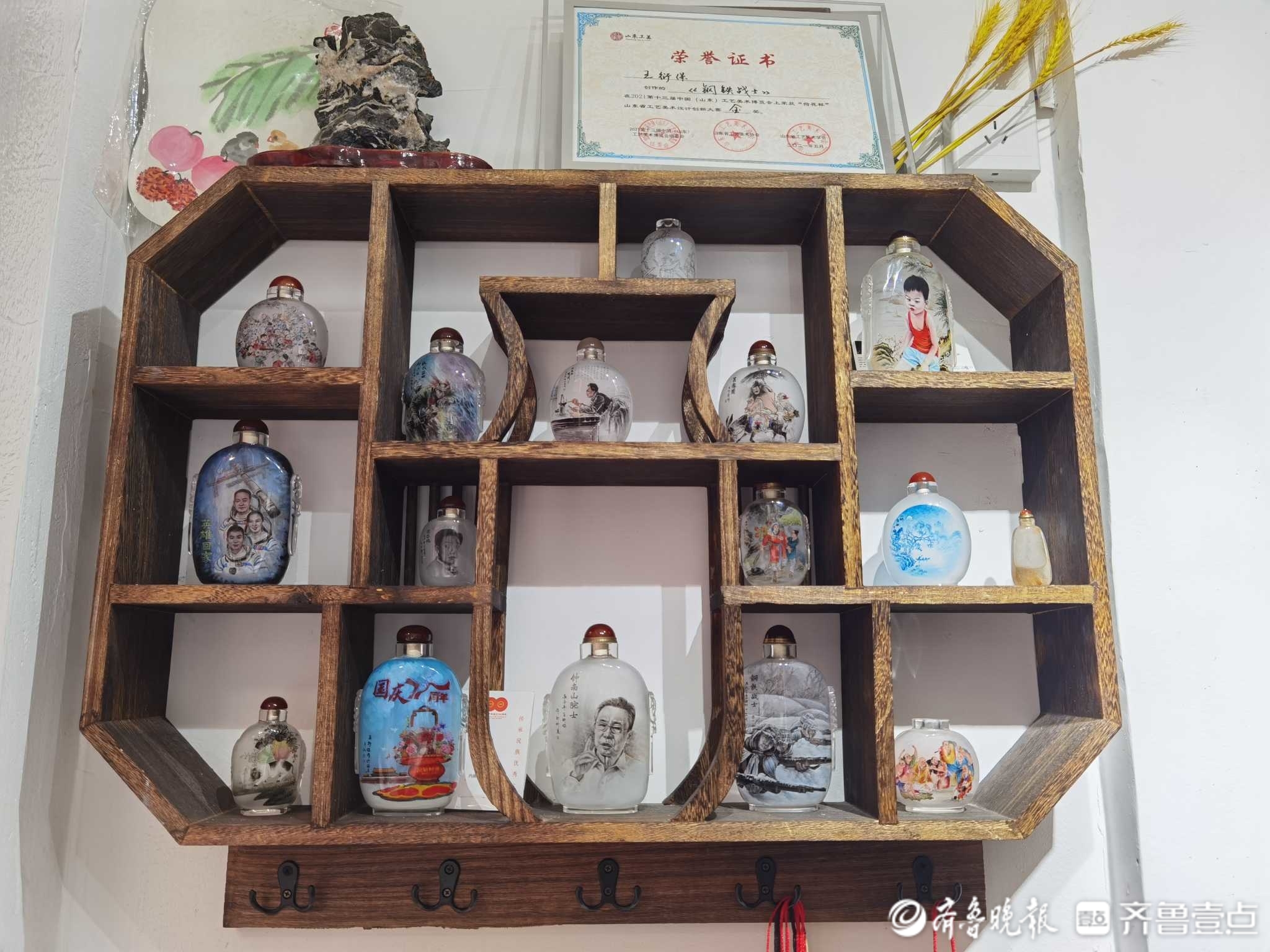 工作室中的博古架上,摆放着王衍保这些年所制作的内画鼻烟壶作品,有的勾画了名人肖像,栩栩如生;有的勾勒着淡雅的山水画,别有一番雅致的风味;有的绘制了节日大事记,纪念具有特殊意义的日子。