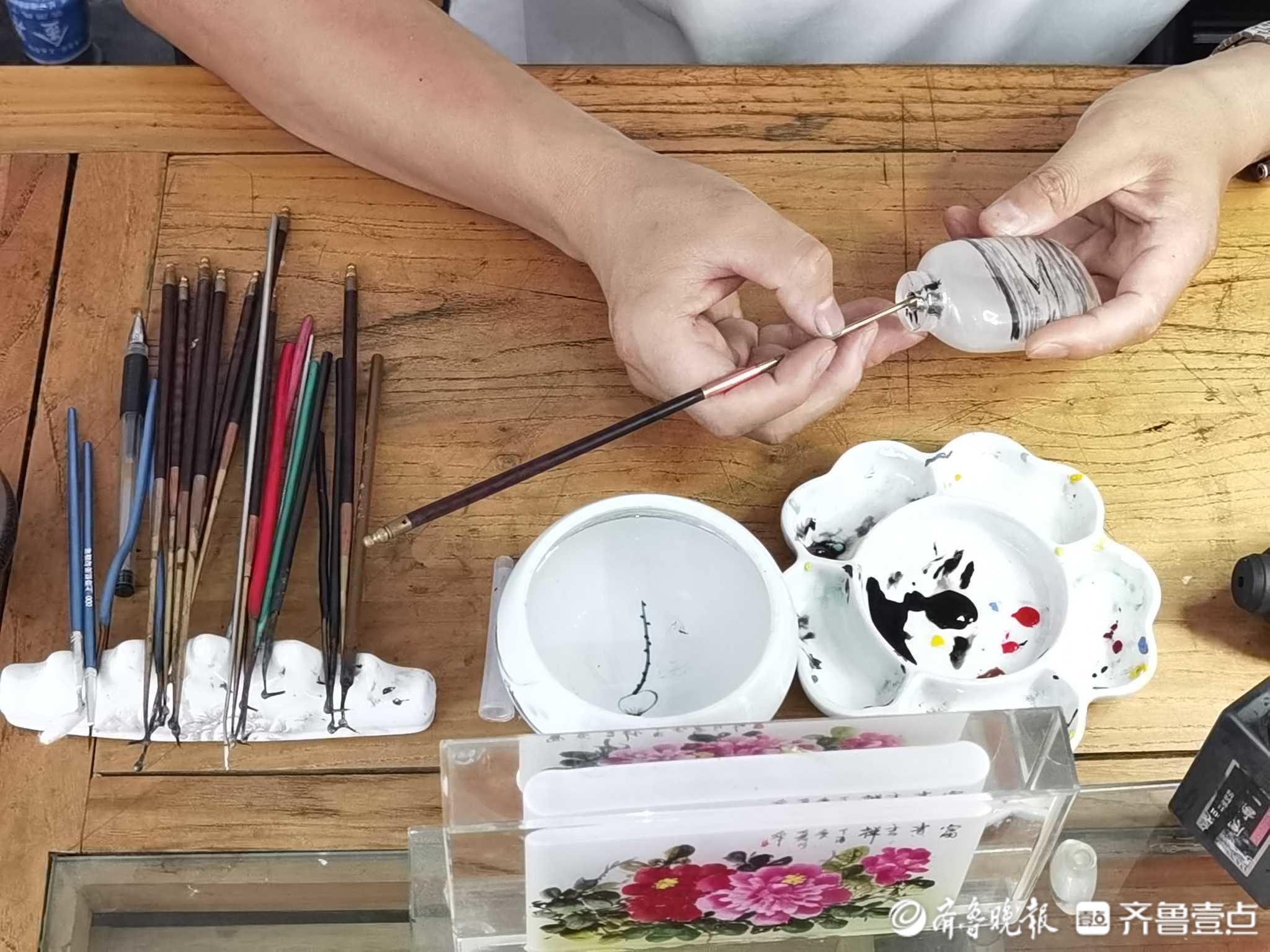 在位于济南大观园的非遗传承基地,济南内画鼻烟壶非遗传承人王衍保正安静地坐在木椅上,沉浸于自己的绘画世界,仔细一看,他居然在鼻烟壶的内部“反手”作画。狭小的空间中,王衍保用一支笔、一个壶,让绘画世界鲜活起来。