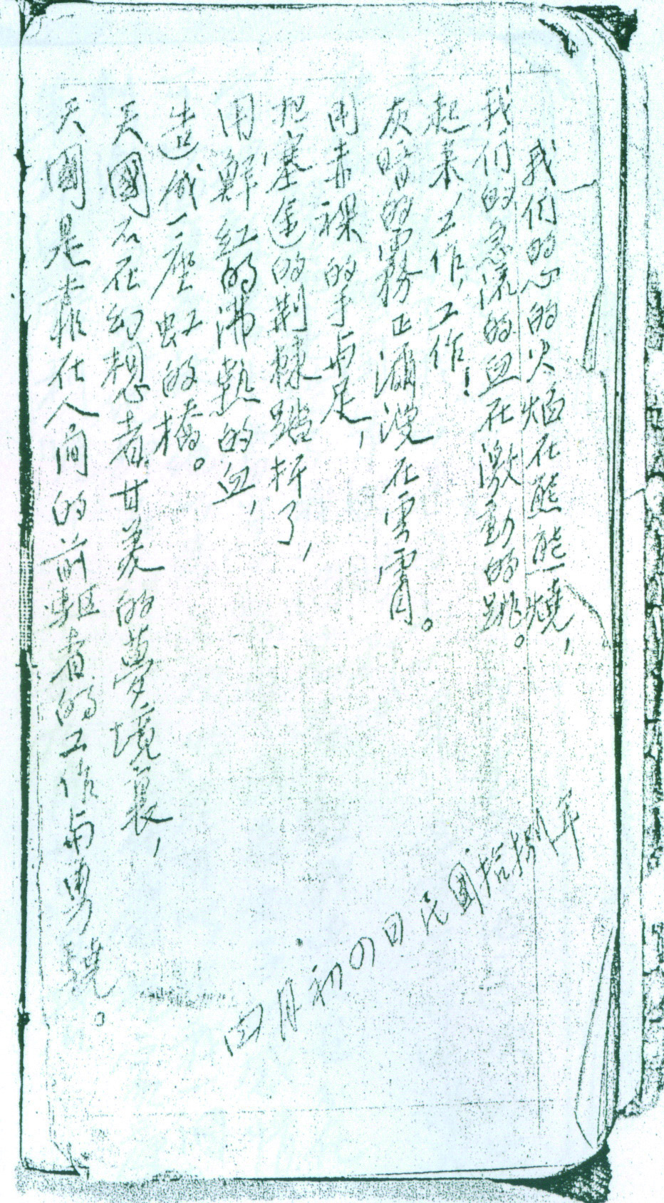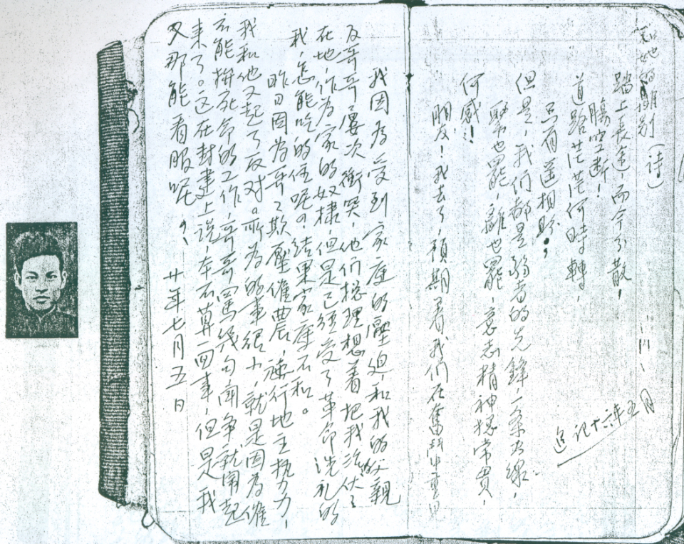 这张照片拍摄于1925年。当时在济南求学的日照籍青年安哲、郑天九、陈雷等人,认识了同是日照籍的共产党人丁君羊,经丁君羊介绍认识了山东省委负责人邓恩铭,在邓恩铭和丁君羊的倡导下成立党的外围组织——少年日照学会。从此,他们在党的指引下开展活动,阅读进步书刊、了解时事政治、关心国家前途命运,从而走上了革命道路。安哲、郑天九、陈雷先后加入中国共产党。1926年10月经山东党组织发动,他们三人都赴武汉参加北伐,经受了血与火的革命锻炼,1927年蒋介石、汪精卫先后发动反革命政变,大肆屠杀共产党人,中国大地处在一片血雨腥风的白色恐怖当中,轰轰烈烈的大革命失败。为保存革命火种,根据党组织安排,安哲、郑天九、陈雷要被派回家开展土地革命。在武汉分别时,安哲赋诗一首表达战友惜别和期待投入新的战斗的壮志豪情。
