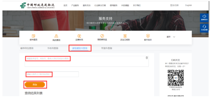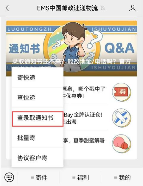 关注“EMS中国邮政速递物流”微信公众号,菜单中找到“寄件”——“查录取通知书”,点击进入查询页面,按照提示进行查询;也可以在微信小程序中打开“EMS中国邮政速递物流”,点击搜索栏,选择“高考邮件”,根据提示进行查询。