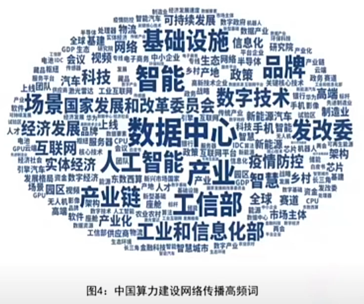 通过对中国算力建设的媒体报道高频词分析,数据中心、智能、算力、产业、东数西算、国家发展和改革委员会、工业和信息化部、基础设施、数字技术等词出现频率较高,成为网络传播热词。